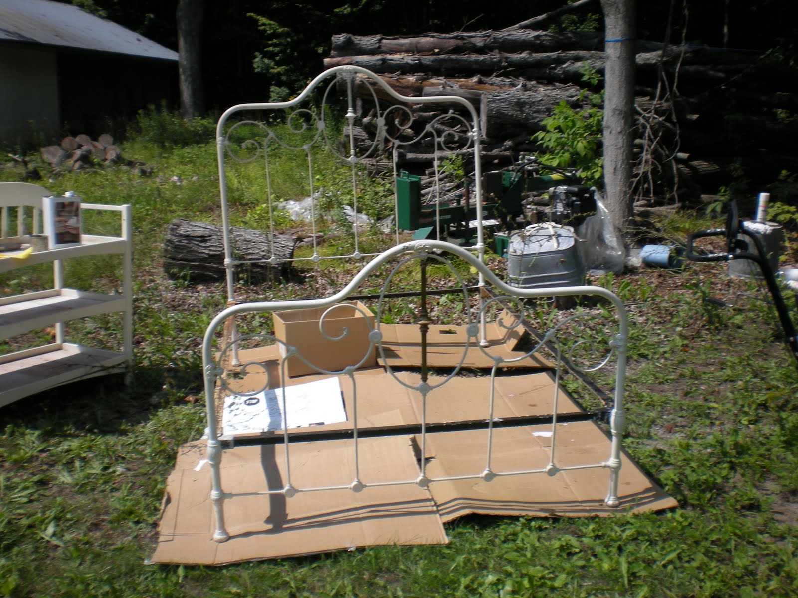 I had some large old cardboard boxes which I opened up and placed on the lawn in the back yard. I did not want the old paint and stripper gunk to land on the lawn. Next I set up the bed and pulled an old diaper changing table out of the barn to use as my work table. (I got that change table out of the dump 20 years ago and it has been used for many purposes such as a storage shelf, potting bench to name a few.)