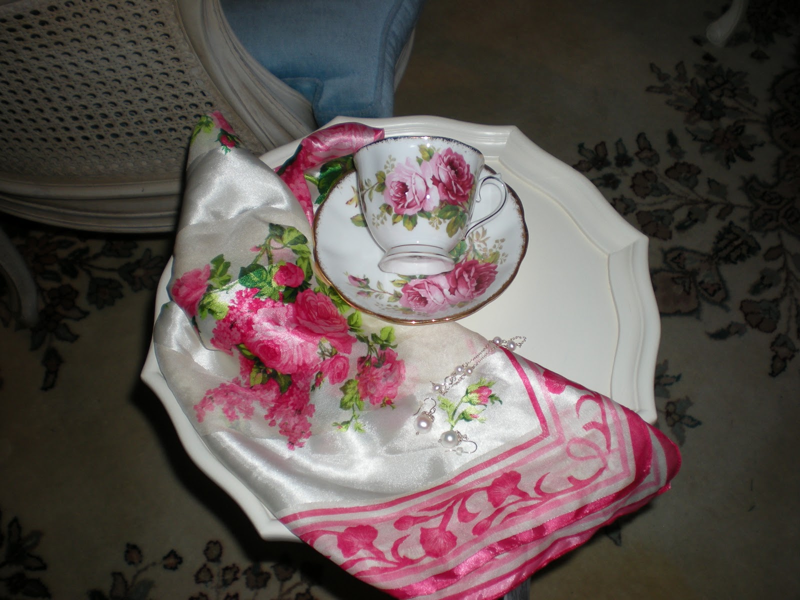 I am giving away a Royal Albert "American Beauty" cup and saucer, a gorgeous scarf covered with roses made by Tabi, a sterling and freshwater pearl bracelet and a pair of sterling and freshwater pearl dangling earrings. I will draw the winner on my fifty-first birthday!!! January 13th, 2011 at twelve o'clock noon EST (my time zone).